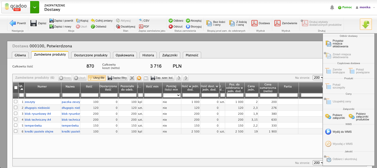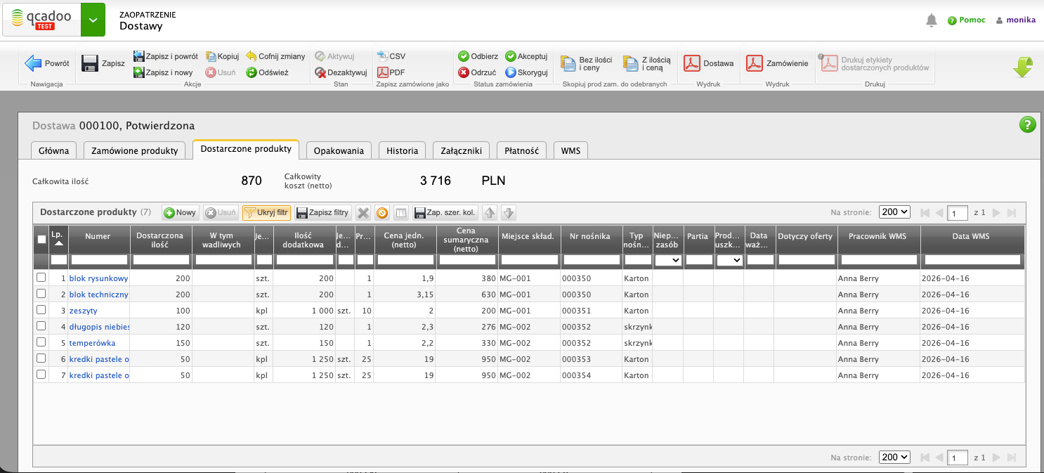 Dział zakupu zamówił potrzebne towary. Dostawa, która w qcadoo wygląda tak: