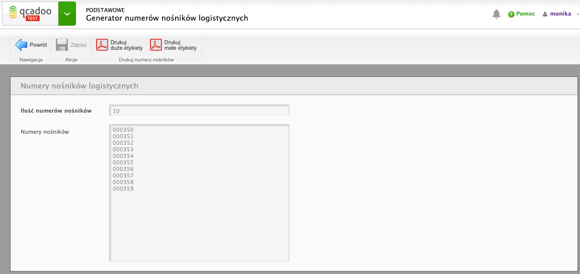 Pracownicy na przyjęciu towaru na magazynie dbają o to, by mieć stale wydrukowane numery nośników. Generują je z qcadoo, wchodząc w Podstawowe > Generator numerów nośników logistycznych. Podają liczbę potrzebnych numerów i zapisują, co powoduje ich wygenerowanie: