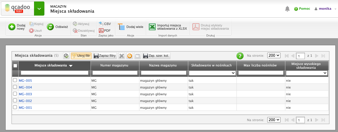 Magazyn w qcadoo ma wydzielone miejsca składowania. Miejsca składowania te mają zaznaczony parametr Składowanie na nośnikach. Ale nie mają wyznaczonej maksymalnej ilości nośników w miejscu - firma nie potrzebuje takiej walidacji.