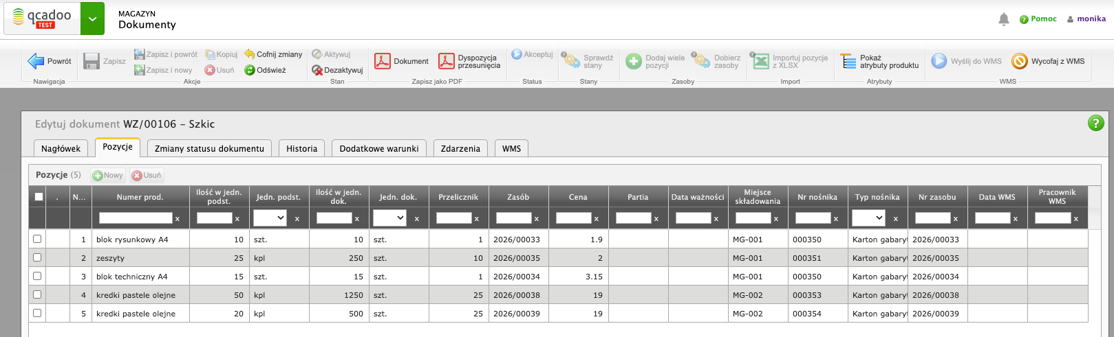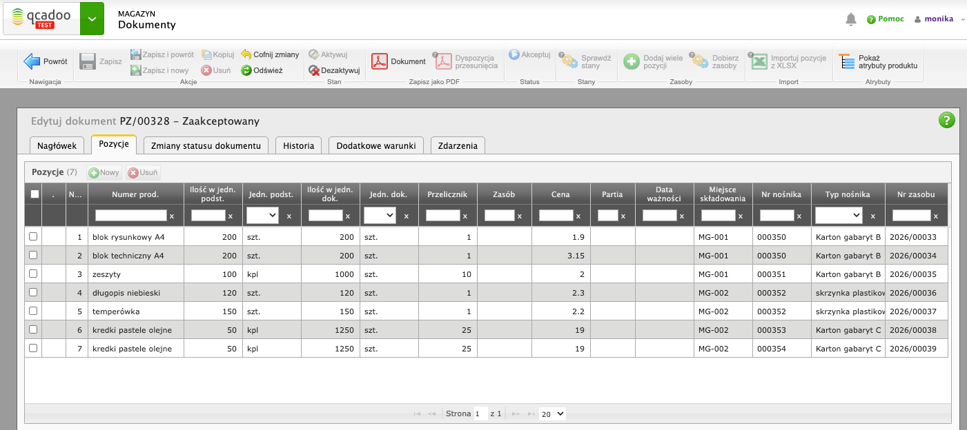 Firma STAR Artykuły Biurowe prowadzi w qcadoo magazyn, na którym towar składowany jest w różnych nośnikach - część w skrzynkach, część w kartnonach, a część na paletach. Rozdział ten przedstawi standardowy sposób pracy z nośnikami podczas odbioru dostawy i wydania towaru klientowi.