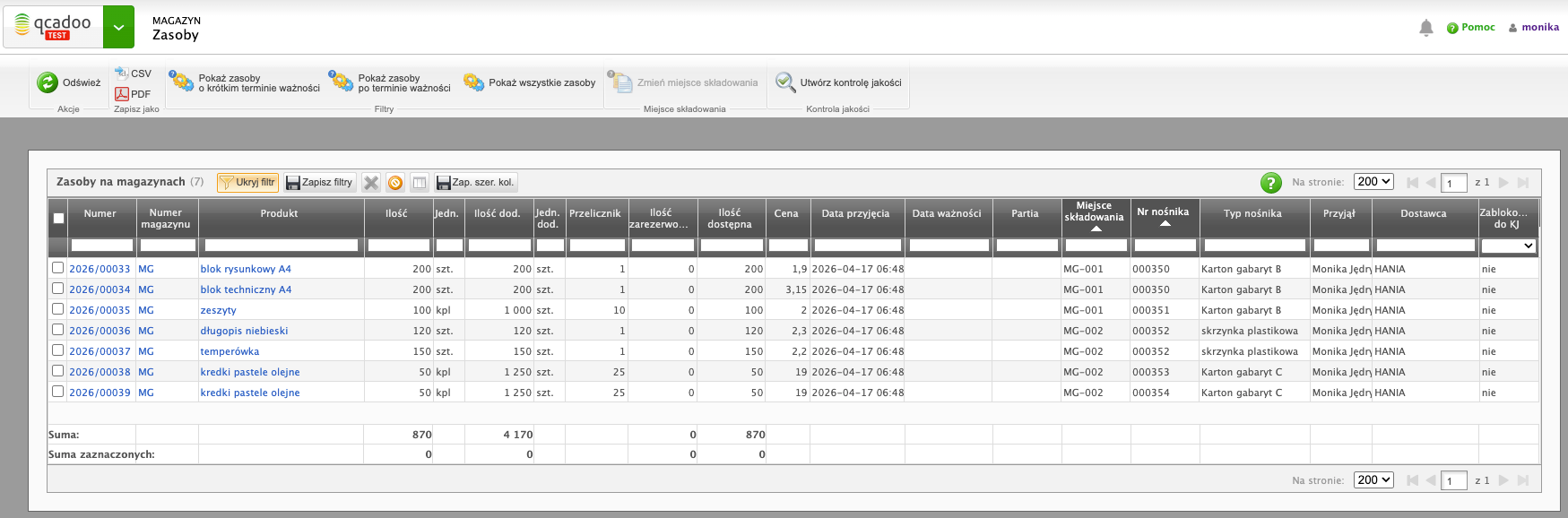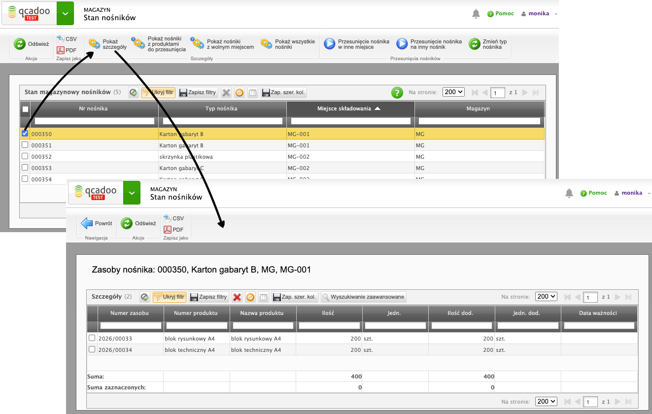 Patrząc w stan magazynowy w qcadoo widoczne jest w jakich nośnikach jakie produkty się znajdują: