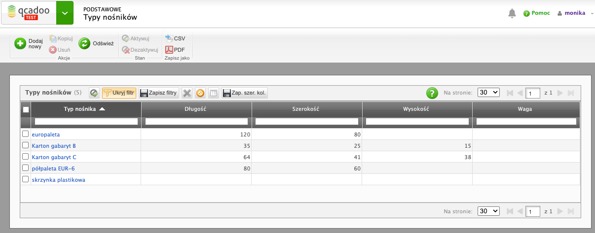 W qcadoo zdefiniowane są typy wykrzystywanych nośników: