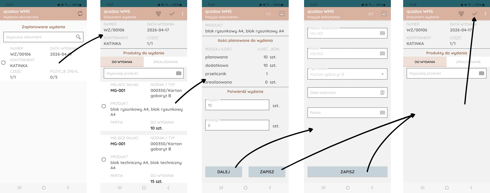 Dostawa omówiona. Przejdźmy teraz do wydań magazynowych. Dział sprzedaży utworzył dokument WZ, dobrał w nim zasoby (dzięki temu wiadomo skąd produkty powinny zostać pobrane, czyli z jakiej lokalizacji i nośnika) i wysłał go do aplikacji WMS mobile. Jeśli dany produkt będzie musiał być skompletowany z dwóch nośników, to pozycja zostanie rozbita na dwie.