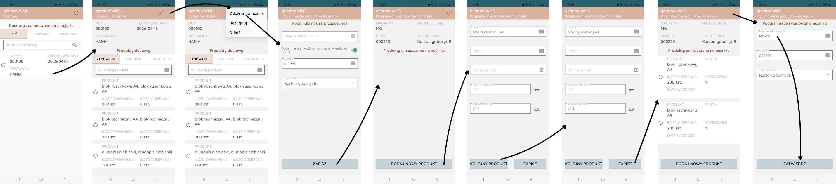 Pani Anna, magazynierka, wybiera w aplikacji WMS mobile dostawę i po kolei przyjmuje produkty. Decyduje, by przygotować karton z blokami. Bierze papierową etykietę z numerem nośnika i nakleja ją na karton. W aplikacji używa funkcji Odbierz na nośnik - aby podać nośnik, skanuje kod z etykiety: