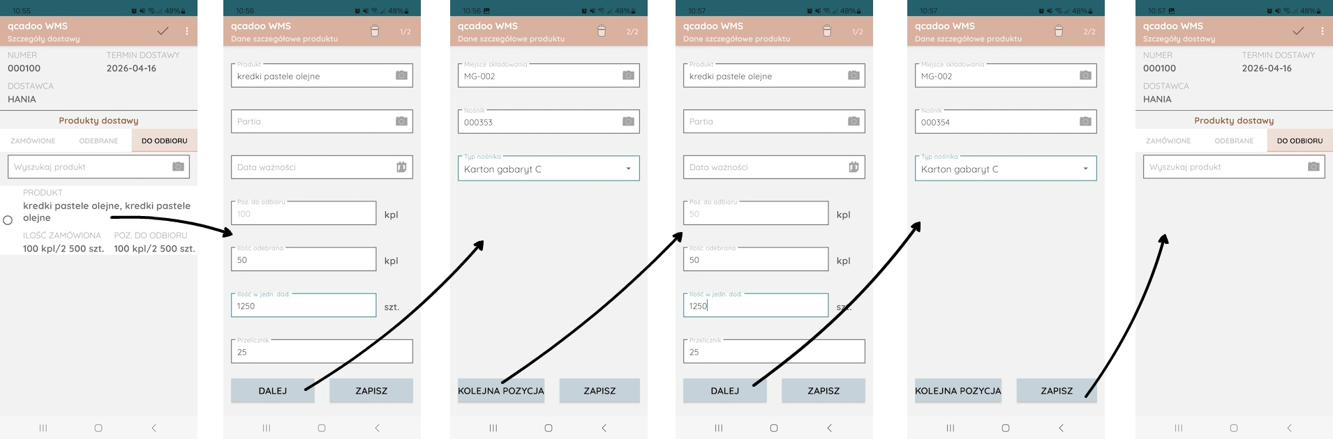 Podobnie realizowane są przyjęcia dla pozostałych zamówionych pozycji. Po zakończeniu procesu - Pani Anna potwierdza realizację. W efekcie w qcadoo produkty dostarczone wyglądają tak: