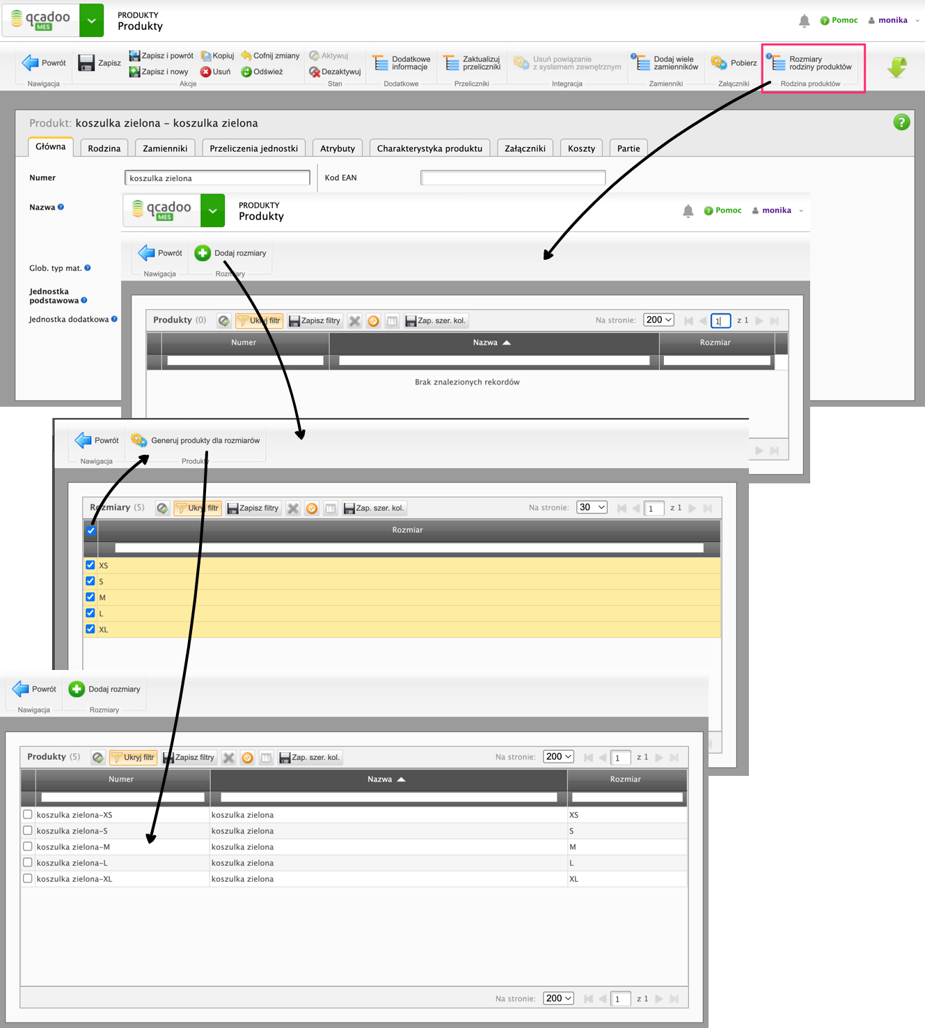W produkcie klikamy przycisk Rozmiary rodziny produktów i Dodaj rozmiary. Zaznaczamy rozmiary, w jakich produkty występują i zatwierdzamy przyciskiem Generuj produkty dla rozmiarów. W efekcie utworzy się tyle produktów ile zaznaczonych rozmiarów. Wszystkie produkty zostaną powiązane ze wskazaną rodzinę produktów.