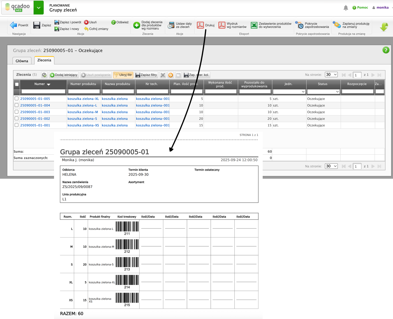Zaznacz w zamówieniu sprzedaży pozycje, które chcesz objąć jedną grupą i wywołaj funkcję Generuj grupę zleceń. Zapisujemy. I gotowe - zlecenia założone. Można je teraz wydrukować, korzystając z jednego z dwóch szablonów. Na wydruku są kody kreskowe, które pozwolą na raportowanie zbiorczo zleceń.