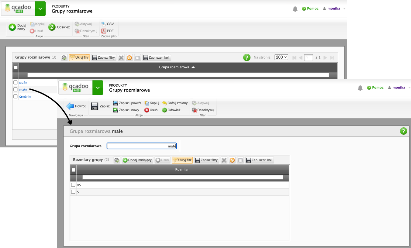 Teraz przechodzimy do zdefiniowania grup rozmiarowych - przydadzą się w technologiach, gdy trzeba będzie rozróżnić produkty zaplanowane do zużycia. Wchodzimy do Produkty > Grupy rozmiarowe, definiujemy grupy i do każdej przypisujemy rozmiary: