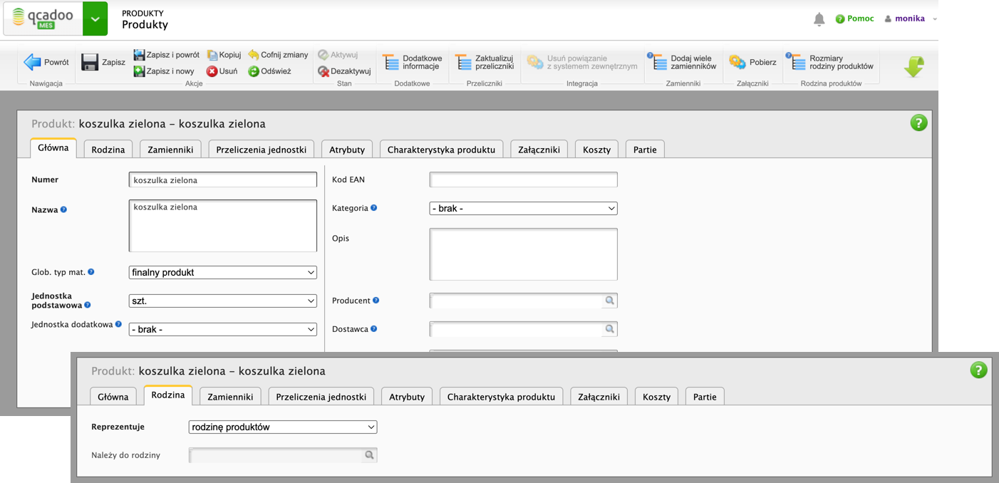 Przejdźmy do zdefiniowania produktów. W Produkty > Produkty wprowadźmy rodzinę produktu, dla każdego modelu koszulki w danym kolorze: