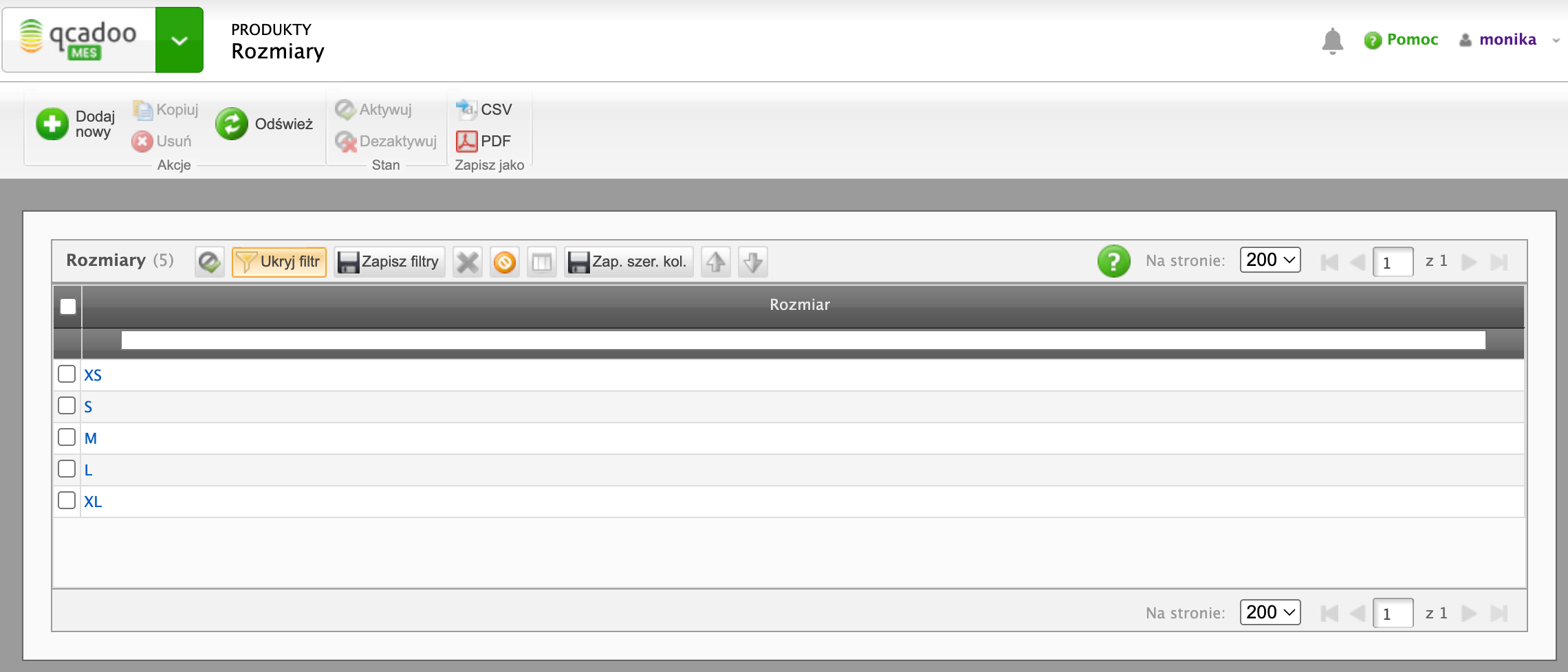Zacznijmy od zdefiniowania rozmiarów. W Produkty > Rozmiary wprowadzamy rozmiary, w których wytwarzamy wyroby: