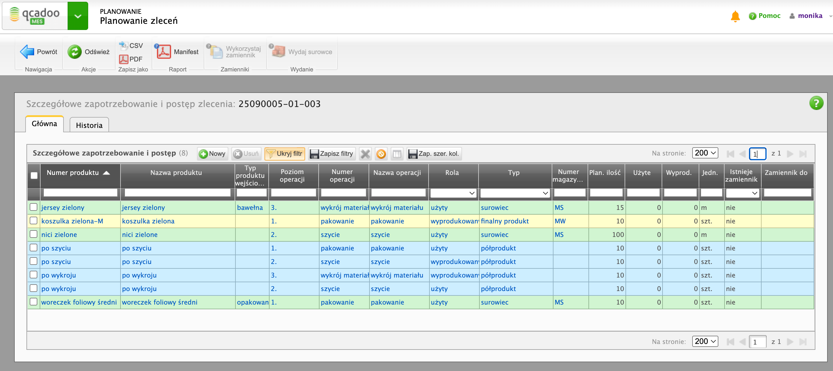 Zwróć uwagę, że w zleceniu produkcyjnym, w szczegółowym zapotrzebowaniu prezentującym wszelkie potrzebne w procesie produkty, zostały dobrane właściwe dla rozmiaru produkty i ilości.