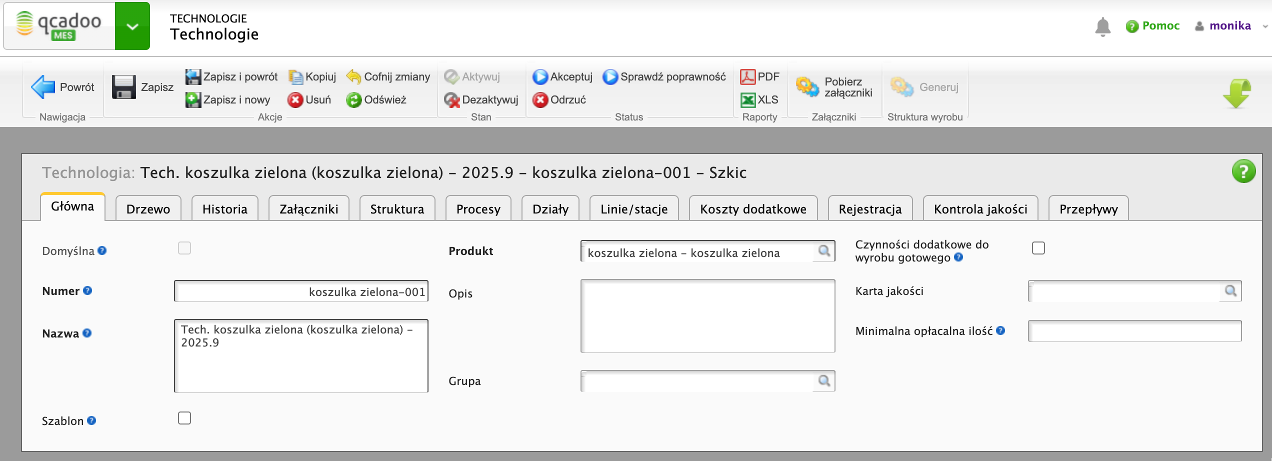Dokończmy tworzenie technologii - po wypełnieniu drzewa operacjami i produktami, wskaż miejsca wykonania (działy, linie, stacje robocze), przepływy produktów (z jakich magazynów mają być pobierane i na jaki magazyn przyjmowane), a także, jeśli potrzeba: kontrola jakości, procesy technologiczne, dodatkowe koszty. Technologia gotowa powinna zostać zaakceptowana.