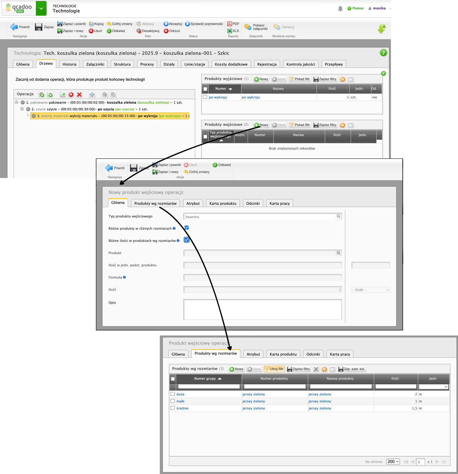 Tworzymy drzewo, układając po kolei operacje do wykonania. I przechodzimy do dodawania produktów wejściowych. Klikam w operację i dodaję produkt w dolnej tabeli. Dla produktów, których zużycie ma być różne, w różnych rozmiarach, podaję typ produktu wejściowego i zaznaczam parametry Różne produkty w różnych rozmiarach oraz Różne ilości w produktach wg rozmiarów. Przechodzimy do zakładki Produkty wg rozmiaru i dodajemy jaki produkt ma być zużyty w danej grupie rozmiarowej i w jakiej ilości. I tak rozpisuję każdy wariant: