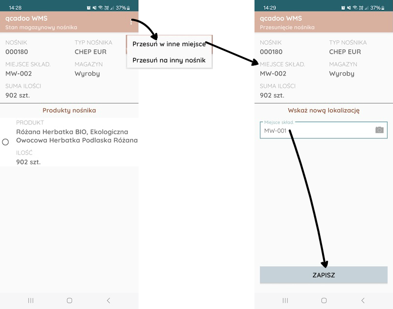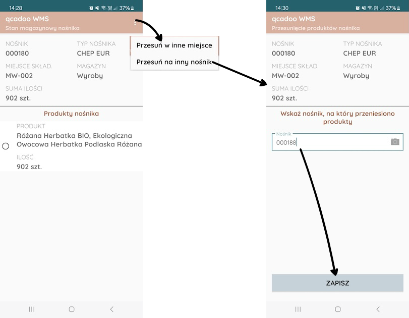 Funkcja przesunięcia produktów nośnika na inny nośnik dostępna jest z dwóch miejsc: