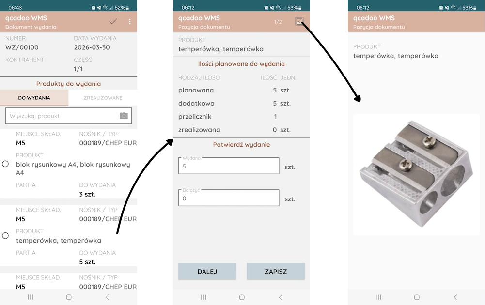 Dla każdego produktu zaplanowanego do skompletowania możesz podejrzeć zdjęcie. Będąc w szczegółach pozycji dokumentu kliknij przycisk