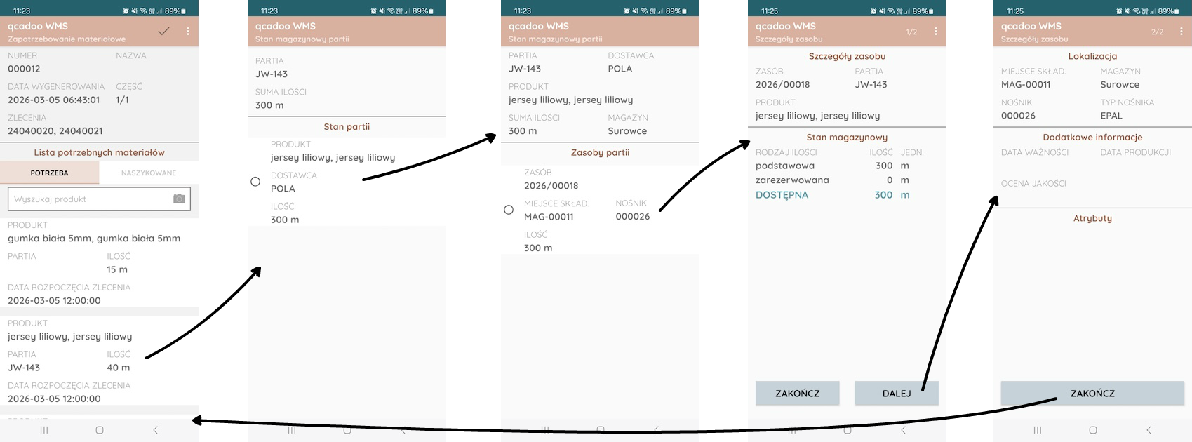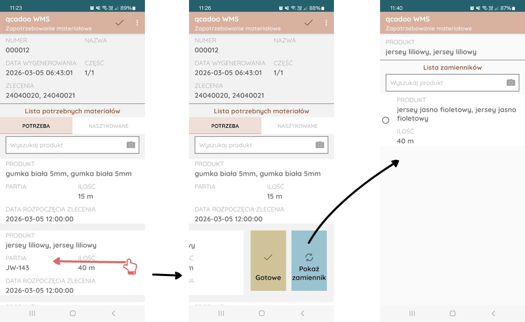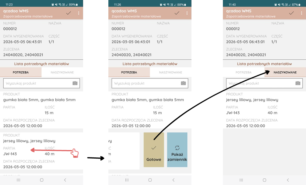 Zapotrzebowanie materiałowe pozwala na przygotowanie niezbędnych do produkcji surowców. Magazynier otrzymuje listę produktów wraz z ilościami. Dla każdego produktu może w aplikacji ustalić gdzie produkt jest składowany i gdzie go znaleźć. Po pobraniu może odhaczyć pozycję jako gotową. To jest tylko flaga. Funkcja nie powoduje żadnych ruchów magazynowych. Jest tylko odzwierciedleniem wydruku zapotrzebowanie materiałowe.