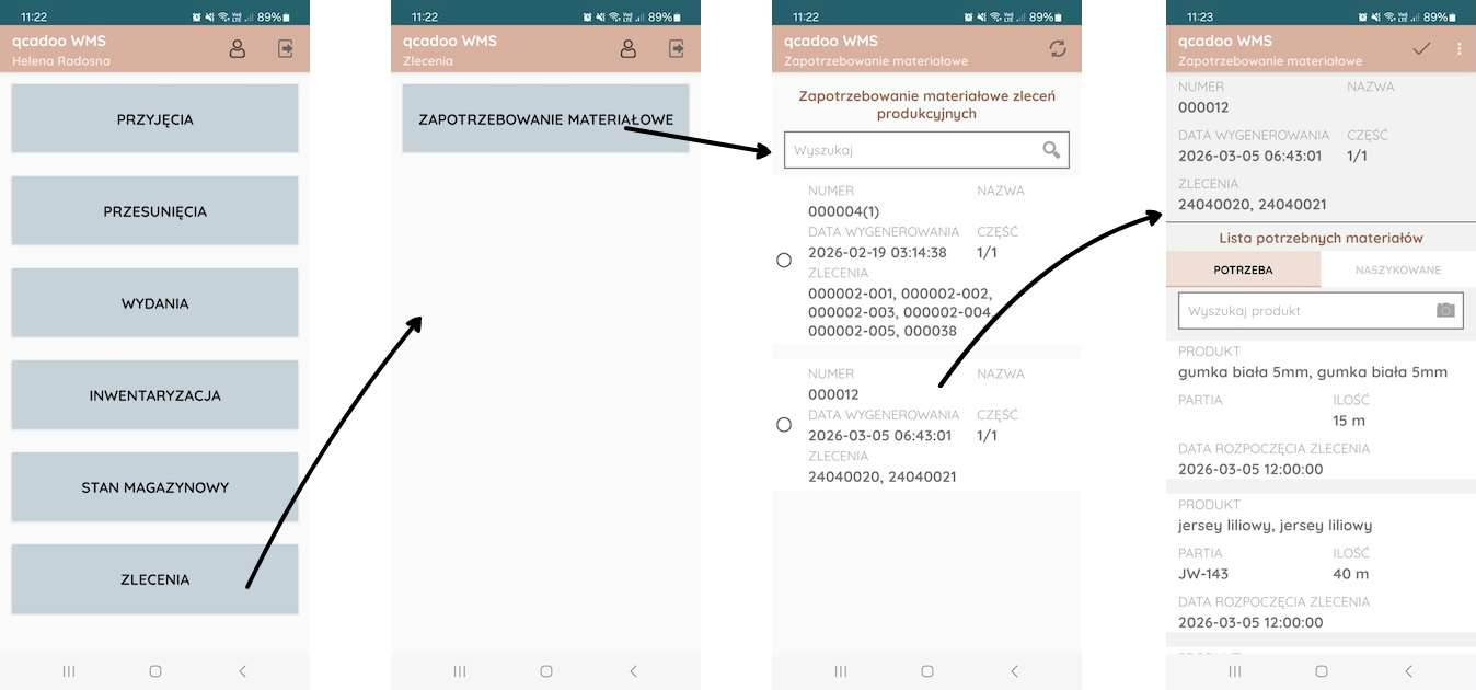 Zapotrzebowanie materiałowe w aplikacji qcadoo WMS mobile dostępne jest w Zlecenia > Zapotrzebowanie materiałowe