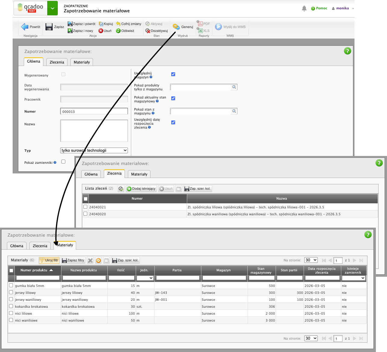 Początek procesu musi wydarzyć się w systemie qcadoo. Dla utworzonych zleceń produkcyjnych wygeneruj zapotrzebowanie materiałowe. Pamiętaj o zaznaczeniu parametrów Uwzględnij magazyn oraz Uwzględnij datę rozpoczęcia zlecenia. Po wygenerowaniu, zamiast drukować zestawienie - wyślij je do WMS przyciskiem