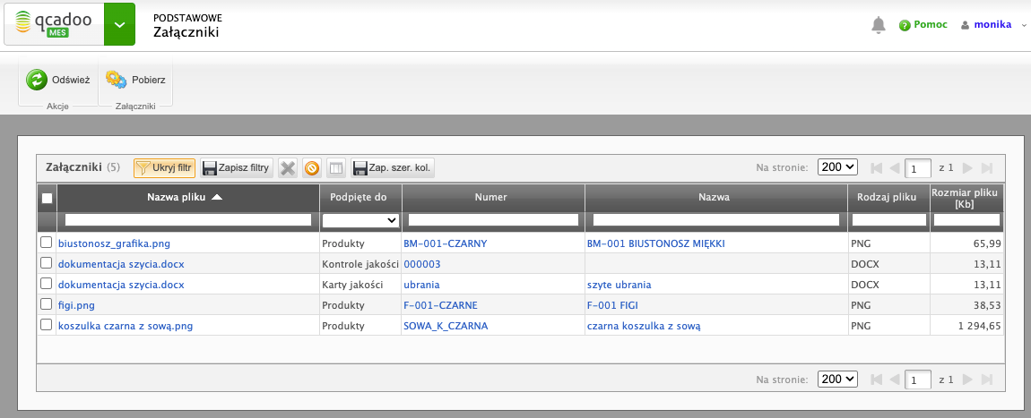 - podpięte do - widoczna jest lista miejsc, w których załączniki w qcadoo mogą być dodane, czyli: produkty, technologie, części, podzespoły, partie, dostawy, kontrole jakości, karty jakości, stacje robocze, zlecenia, narzędzia,